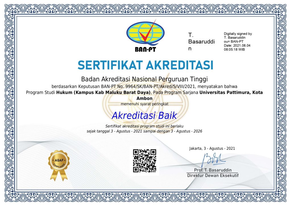 Bedasarkan Keputusan BAN-PT No. 9964/SK/BAN-PT/Akred/S/VIII/2021, menyatakan bahwa Program Studi Hukum (Kampus Kab Maluku Barat Daya), Pada Program Sarjana Universitas Pattimura, Kota Ambon memenuhi syarat Peringkat Akreditasi B