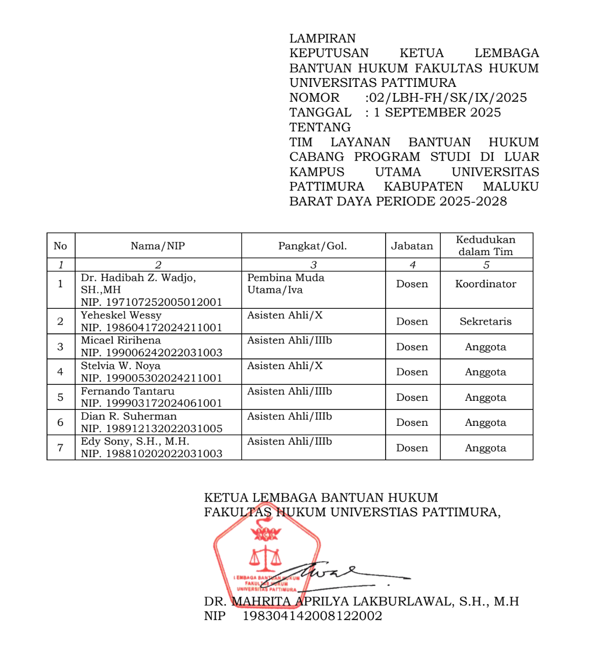 Masyarakat di Kabupaten Maluku Barat Daya kini memiliki akses yang lebih mudah terhadap bantuan hukum. Hal ini menyusul pembentukan Tim Layanan Bantuan Hukum Fakultas Hukum Universitas Pattimura Cabang PSDKU Maluku Barat Daya melalui SK Ketua LBH FH Unpatti Nomor 02/LBH-FH/SK/IX/2025 untuk periode 2025–2028.