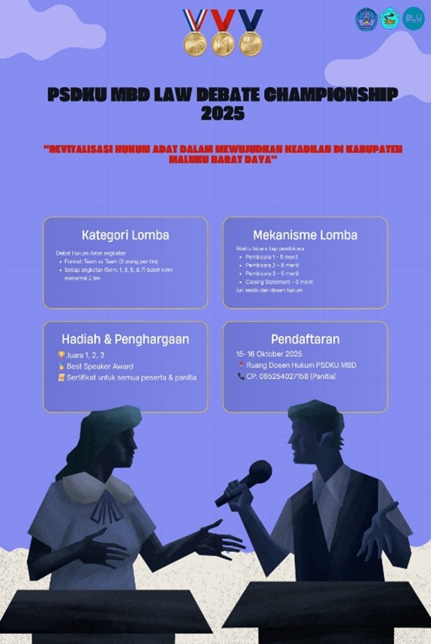 Sehubungan dengan akan diselenggarakannya kegiatan akademik dalam rangka meningkatkan kemampuan berargumentasi dan pemahaman hukum adat, kami mengundang dan memberitahukan kepada seluruh mahasiswa/i aktif Program Studi Hukum PSDKU MBD untuk berpartisipasi dalam: